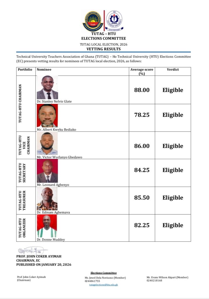 In a related development, vetting results released earlier show that the TUTAG Local Chairman at HTU, Dr. Stanley Nelvis Glate, will face competition from Mr. Albert Kweku Bediako in the local-level election. While all other local aspirants — including Mr. Victor Worlanyo Gbedawo (Vice Chairman), Mr. Leonard Agbenyo (Secretary), Dr. Edinam Agbemava (Treasurer), and Dr. Donne Muddey (Organizer) — go unopposed, the chairman race promises to be the highlight of the local polls.