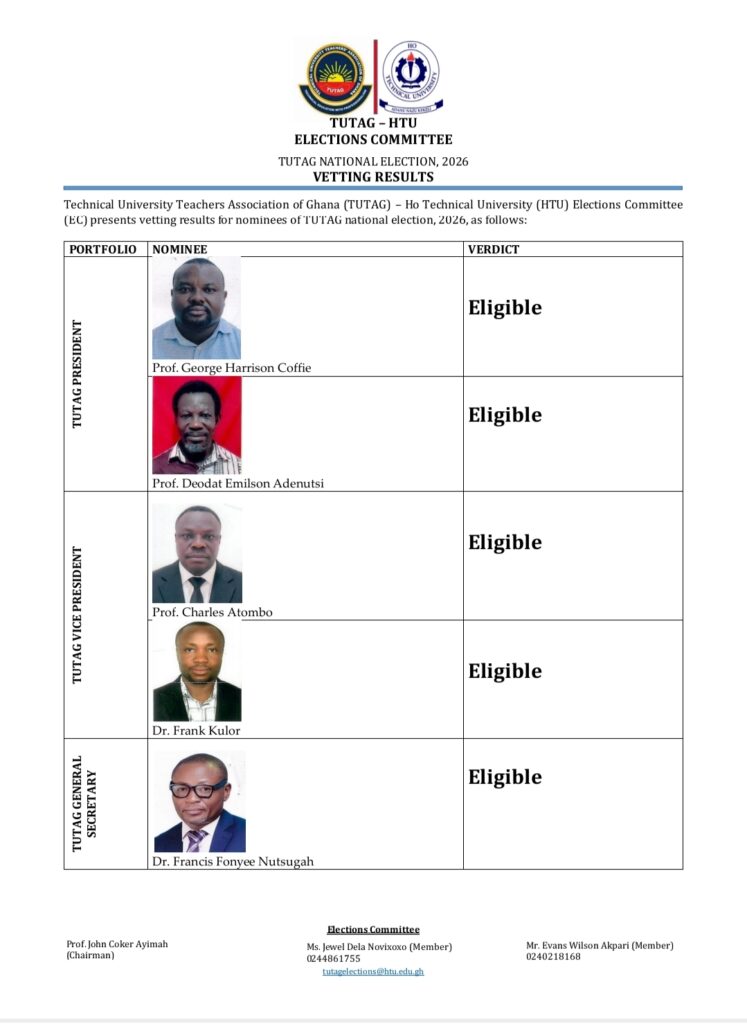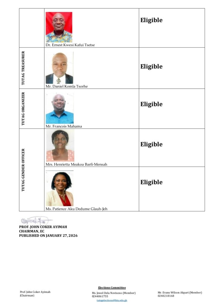 With nine aspirants cleared nationally and a spirited local chairman contest underway, the 2026 elections promise to be both competitive and historic. The outcomes will not only shape the future of TUTAG’s national leadership but also underscore HTU’s stature as a hub of professionalism, inclusion, and academic excellence.